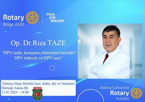 Adana Çukurova Rotary Kulübü tarafından Kadın Doğum Uzmanı Op. Dr. Rıza Taze tarafından dernek üyelerimize konferans düzenlenmiştir.